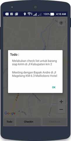 Kami memberikan solusi bagi perusahaan untuk laporan/reporting kunjungan marketing. Aplikasi ini secara otomatis mencatan kunjungan marketing setiap marketing berkunjung kesuatu tempat, dan juga fitur-fitur yang lain seperti Report/Laporan PLAN, Report/Laporan ACTUAL KUNJUNGAN, Report/Laporan FORECAST, Report/Laporan SALES, fitur tracking/pelacakan menggunakan GPS dan masih banyak fitur-fitur yang lain.